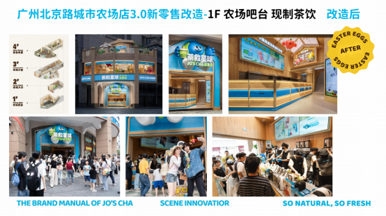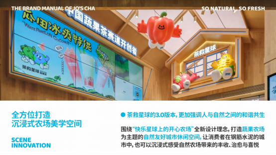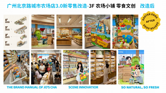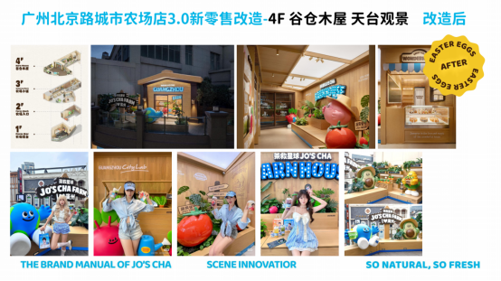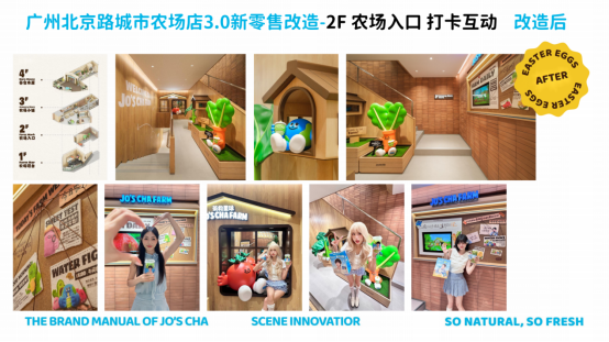 沉浸式空间:升级 3.0 版本,围绕 “快乐星球上的开心农场” 设计理念,打造以蔬果农场为主题的自然友好城市休闲空间。如广州北京路城市农场店,改造后包含农场吧台、农场入口打卡互动、农场小铺(零食文创)、谷仓木屋(天台观景)等区域,让消费者在城市中沉浸式感受自然农场的治愈与喜悦。