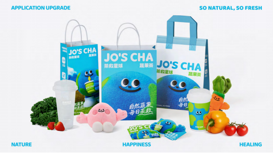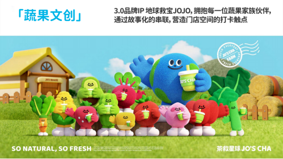 蔬果文创:打造 3.0 品牌 IP “地球救宝 JOJO”,通过故事化串联蔬果家族伙伴(苦瓜、桃子、甜椒等),营造门店空间的打卡触点,并延展推出系列周边产品。