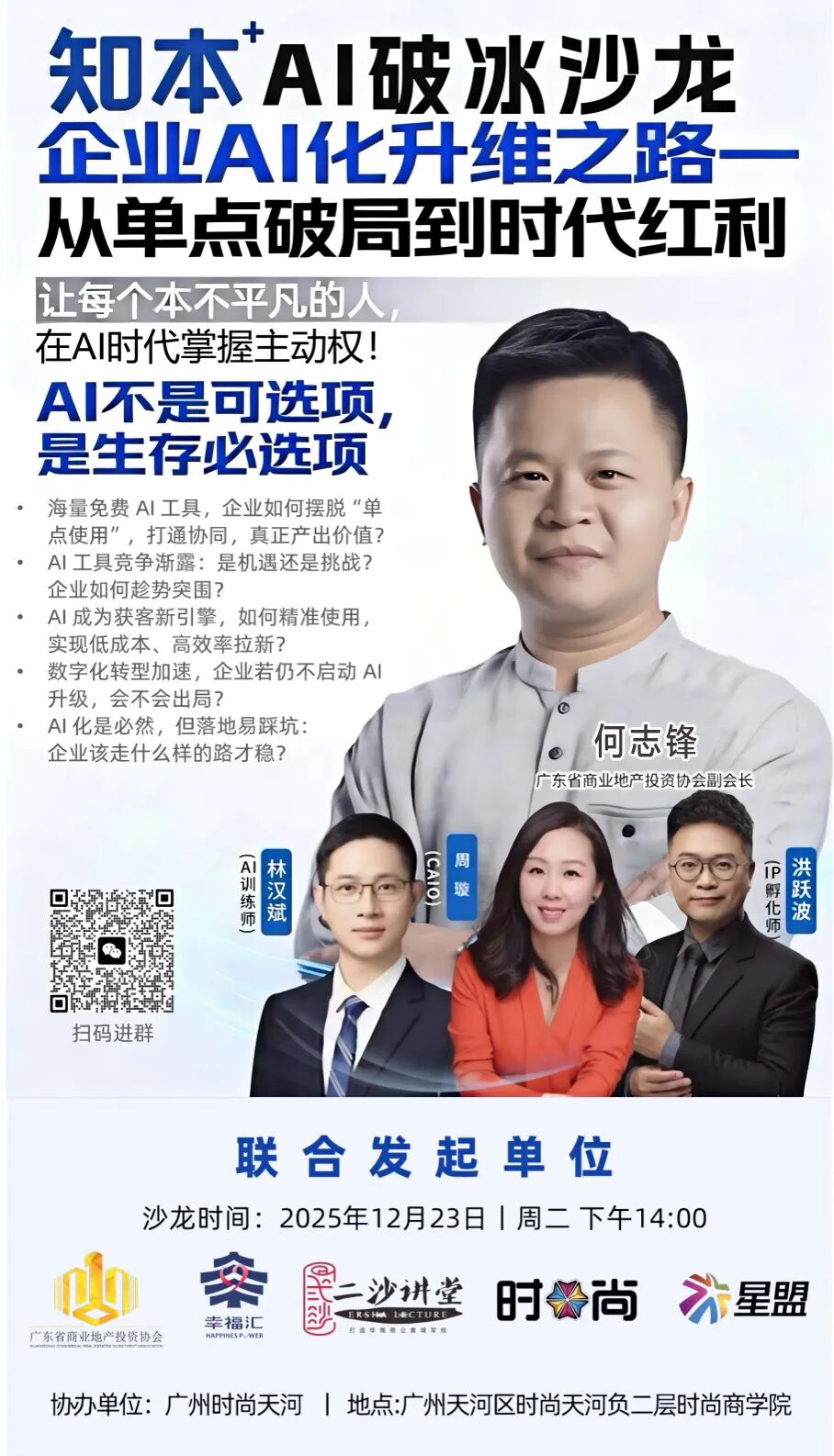 为此,协会与时尚强强联合,携手幸福汇与星盟,共同发起本次 「知本 AI 破冰沙龙」。聚焦 “企业 AI 化升维之路 —— 从单点破局到时代红利”,邀请行业实战专家与你面对面,拆解商业地产企业 AI 化的落地难题,找到适合自身的破局路径!